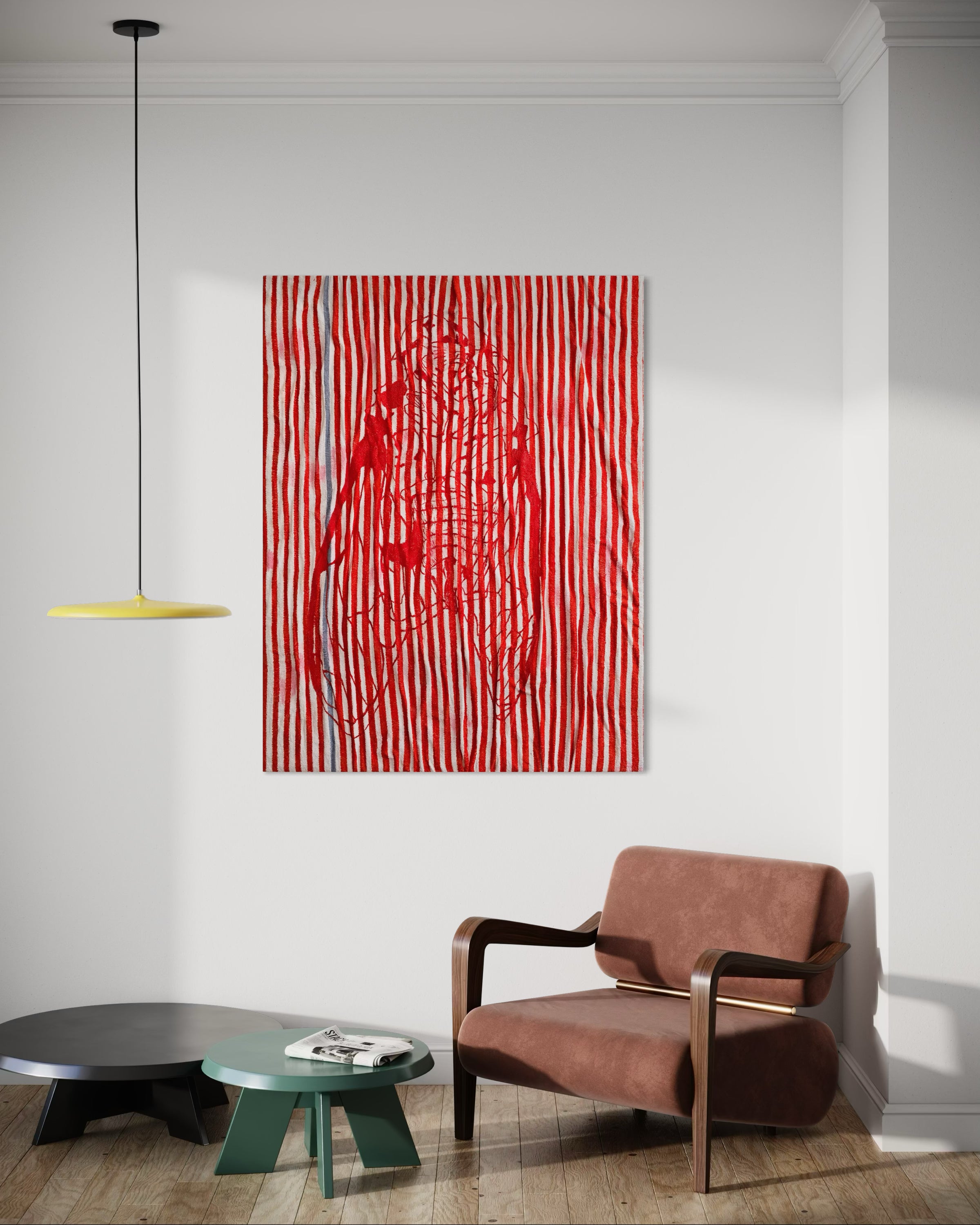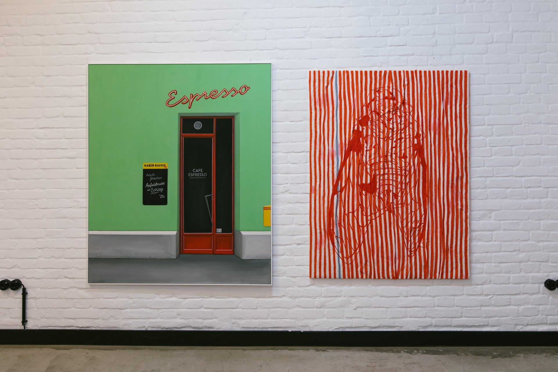 Kater D. works with what others miss or discard: everyday fabrics, textiles, sketches, photographs, found objects – even (cat) hair. This ever-growing material archive forms the foundation of a practice where painting, object, and collage merge. In the series Straßenperlen (Street Pearls), the gaze turns to urban everyday life: fleeting perceptions, incidental structures, the quiet aesthetics of the street. In Ziki in Red, a red-striped terry cloth becomes a ground for an oversized cicada, conjuring the stubborn buzz of summer; material and motif merge into a sensuous, haptic trace of a memory. The everyday sheds its function but retains its intimacy – becoming a carrier for a deeply personal way of seeing.