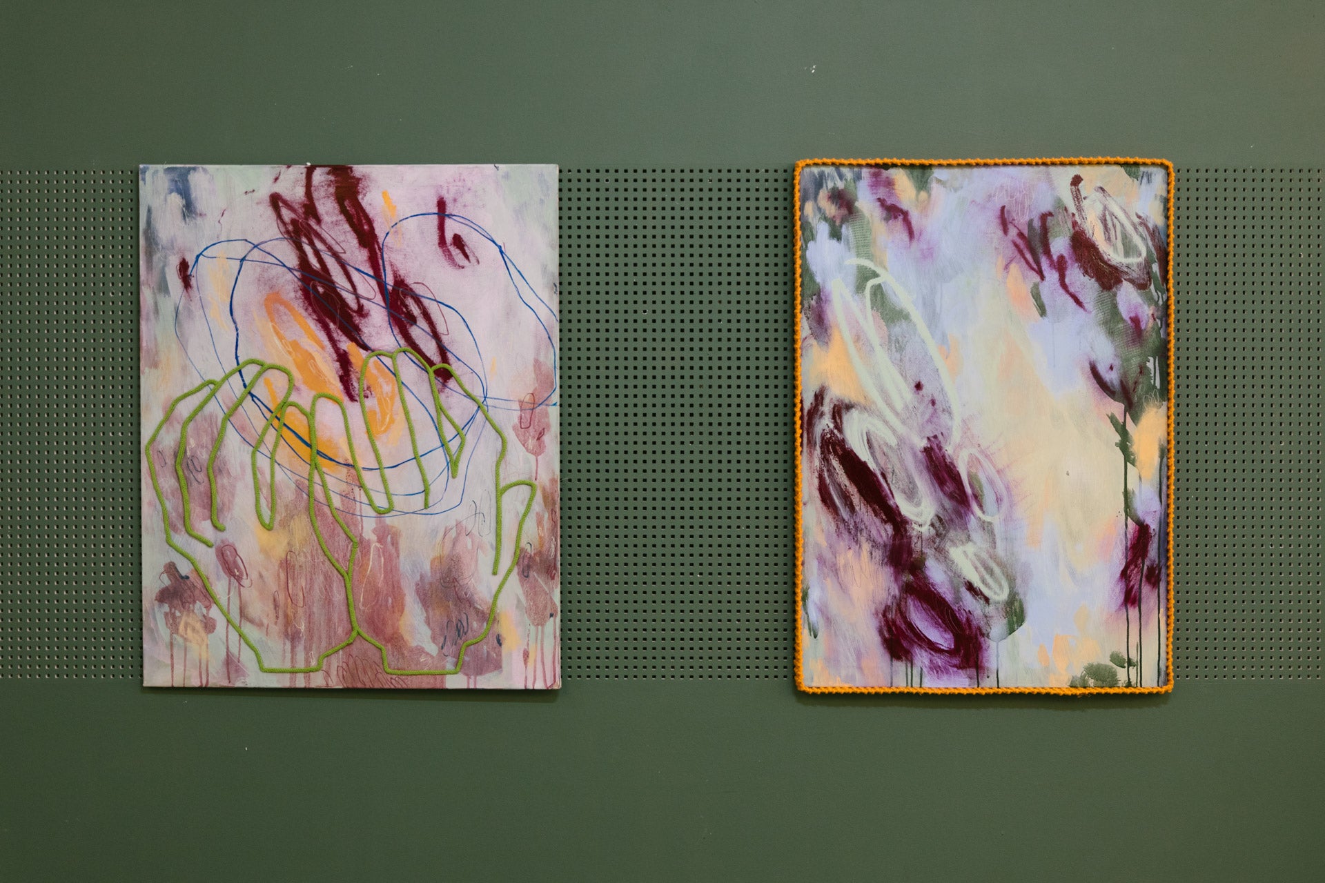 Johanna Wakolbinger translates emotions, memories, and moods into a visual vocabulary that moves between abstraction and suggestion. Acrylic, oil pastel, drawing – layer by layer, she builds vibrating surfaces where fleeting figures, objects, or fragments of text emerge. Her paintings read like visual diaries – immediate, personal, intimate. Yarn forms made with a knitting spool integrate into the compositions as sculptural elements – delicate yet decisive. In Little Bits, Wakolbinger works with painted PVC sheets that are shrunk through heat and linked with fine chains: a constellation of fragments that come together into a sensitive whole while preserving a sense of fragility.